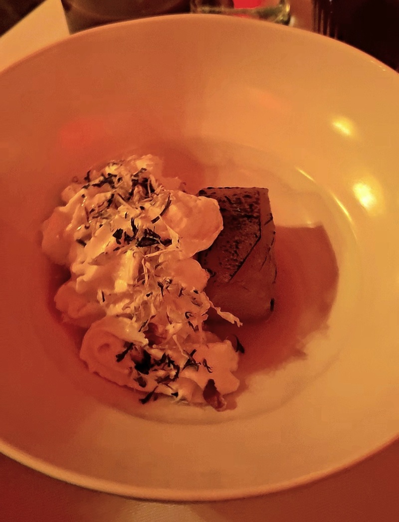 Danie główne rybne przygotował Dominik Karpik - szef kuchni Restauracji MDWA i hotelu Hilton w Gdańsku. Pstrąg, seler, miso, koji i kawior z pstrąga - kompozycja głęboka i pełna subtelnych niuansów. Gołąbek z rakami zapewnił element zaskoczenia - był delikatny, a zarazem bardzo aromatyczny, jak tajemnica zachęcająca do odkrycia. Dodatkiem był także bisque.